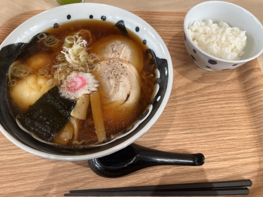 “もちもちラーメン”は醤油ベースのスープに大江町産お米使用の自家製おもちが入ったわんぱくラーメン。